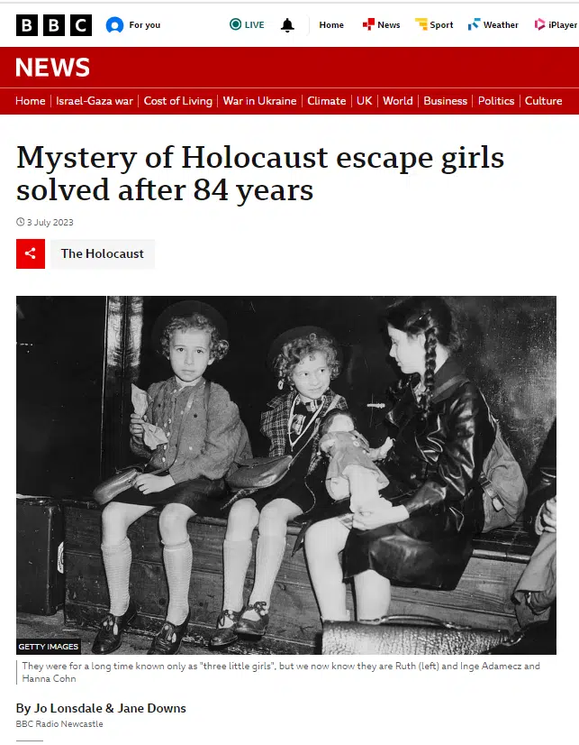 Press coverage about the Kindertransport photograph. Helen’s mother, Hanna, is on the right with plaits.