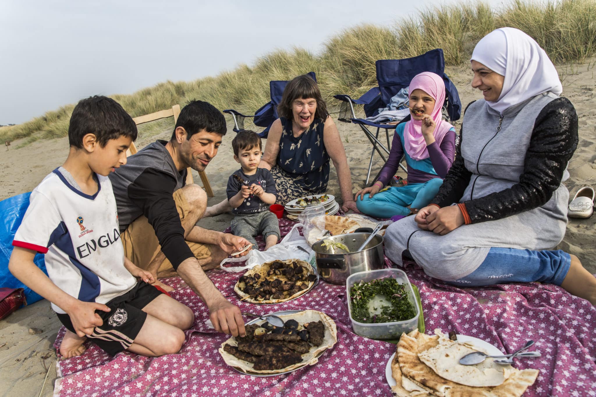 Vicky Moller (centre) has a picnic at a beach in south Wales with the Alchik family, Muhaned, his wife Naheda, and their children (from left) Shadi, 8, Hadi, 1, and Sara, 9. Vicky initiated the Croeso Teifi community group that brought the family to Cardigan. The process started almost three years ago by gathering people, formalising a committee, forming a charity and navigating the application process, including visits to the area by the UK Home Office. ; Muhaned Alchik, his wife Naheda, and their three children arrived in the UK in late-2017 under the Community Sponsorship Programme. Originally from Damascus, they fled their home during the war in Syria. Muhaned is currently studying building maintenance, carpentry and plastering at college. He hopes to work full time after his three-year course and is slotting in odd jobs between studying, including at a Bengali restaurant. Naheda is studying English and acting as the family’s translator – having taught English back home. The two older children now speak fluent Welsh. The Alchik family are part of approximately 220 refugees who have been embraced by local community groups up and down the UK. The refugees, mostly Syrian, come from the Vulnerable Persons Resettlement Scheme (VPRS), managed by UNHCR and the Home Office. The Community Sponsorship Programme allows charities, faith groups, businesses and other local groups to support the initial reception and integration for refugees directly in the UK.