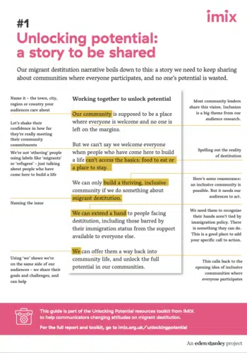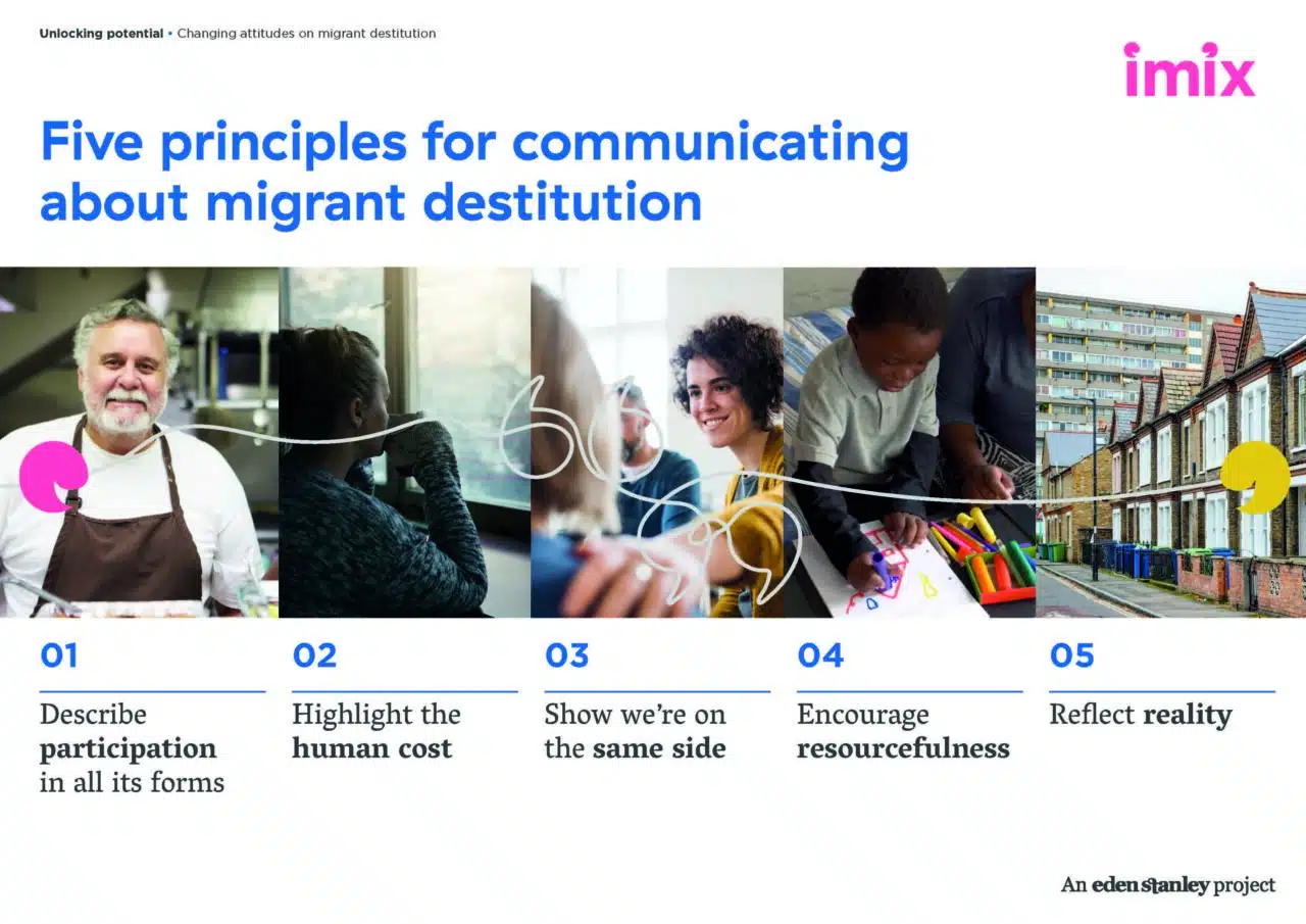 It’s divided into two parts: part one outlines the thinking behind our narrative approach, and the components of a successful narrative on migrant destitution. While part two is a practical set of tools for you to draw on when planning your own communications on this topic, including: